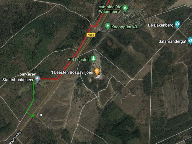 Routebeschrijving: Volg vanuit Apeldoorn de Otterloseweg. Ga bij de afslag naar het Leesten rechtsaf de ventweg op. Als je met de auto bent, ga je waar de ventweg overgaat in een fietspad rechtsaf het terrein van het Staatsbosbeheerkantoor op. Vroeger was het mogelijk langs de Otterloseweg te parkeren, maar deze parkeerplaats is door de provincie opgeheven. Daarom parkeren we de auto’s achter het kantoor van Staatsbosbeheer (Otterloseweg 116) en lopen vanaf daar naar de werkplek. Vanaf de parkeerplaats loopt een pad door het bos. Fietsers kunnen gewoon de Otterloseweg volgen tot een klaphek aan de linkerkant van de weg. Daar staat de keet, waarschijnlijk goed zichtbaar vanaf de Otterloseweg. De weg is vrij overzichtelijk, maar er wordt vaak hard gereden. Let dus goed op bij het oversteken. Zie bijgevoegd kaartje voor de autoroute (rood) en de wandelroute (groen). We zullen wat bordjes neerzetten.