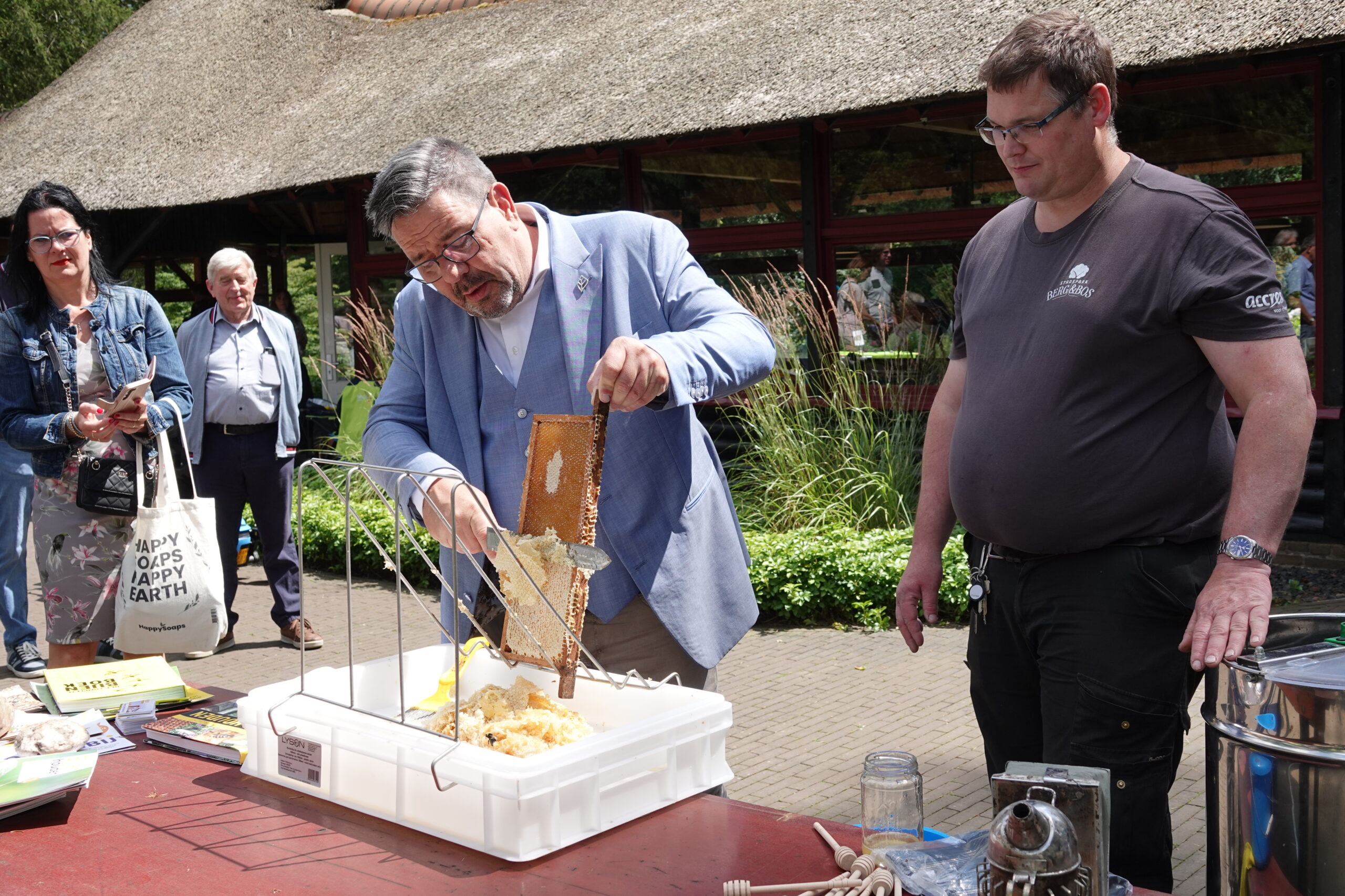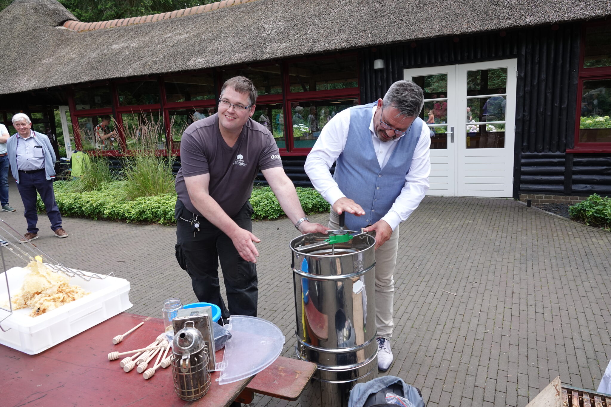 Wethouder Danny Huizer ging onder supervisie van imker Jasper honing slingeren. Voordat hij aan de slag ging sprak hij lovende woorden over de IVN afdeling Apeldoorn. Deze activiteit was in combinatie met de Wilde Floraroute die dit jaar voor de derde keer door IVN Apeldoorn is uitgezet rond de vijver in Berg en Bos. Leuk voor het publiek dat meer wil weten over de wilde bloemen in de Apeldoornse bermen. Maar al die bloemen zijn vooral van levensbelang voor de bijen. Natuurgids Thea Gottmer liet het publiek natuurlijke geuren ervaren. Ook kreeg het publiek de kans de nieuwe inrichting van het Theehuis te bewonderen: een fraai vormgegeven informatiepunt voor de Veluwse natuur en de geschiedenis van Apeldoorn. Al met al een succesvolle zondag.
