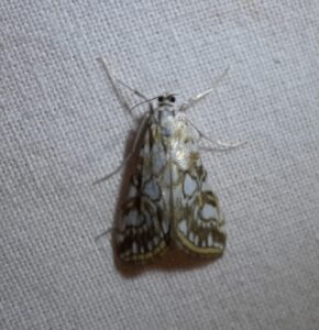 Om 21.30 uur stond het laken gespannen, de felle 250 watt lamp was aan. Jan Kerseboom, nachtvlinder expert van het KNNV Apeldoorn, zag de eerste nachtvlinder: de Oranje wortelboorder. Er waren inmiddels al meerdere mensen, die meekeken naar de verschillende nachtvlinders. Kleine soorten, met grappige namen, zoals de Haarbos.