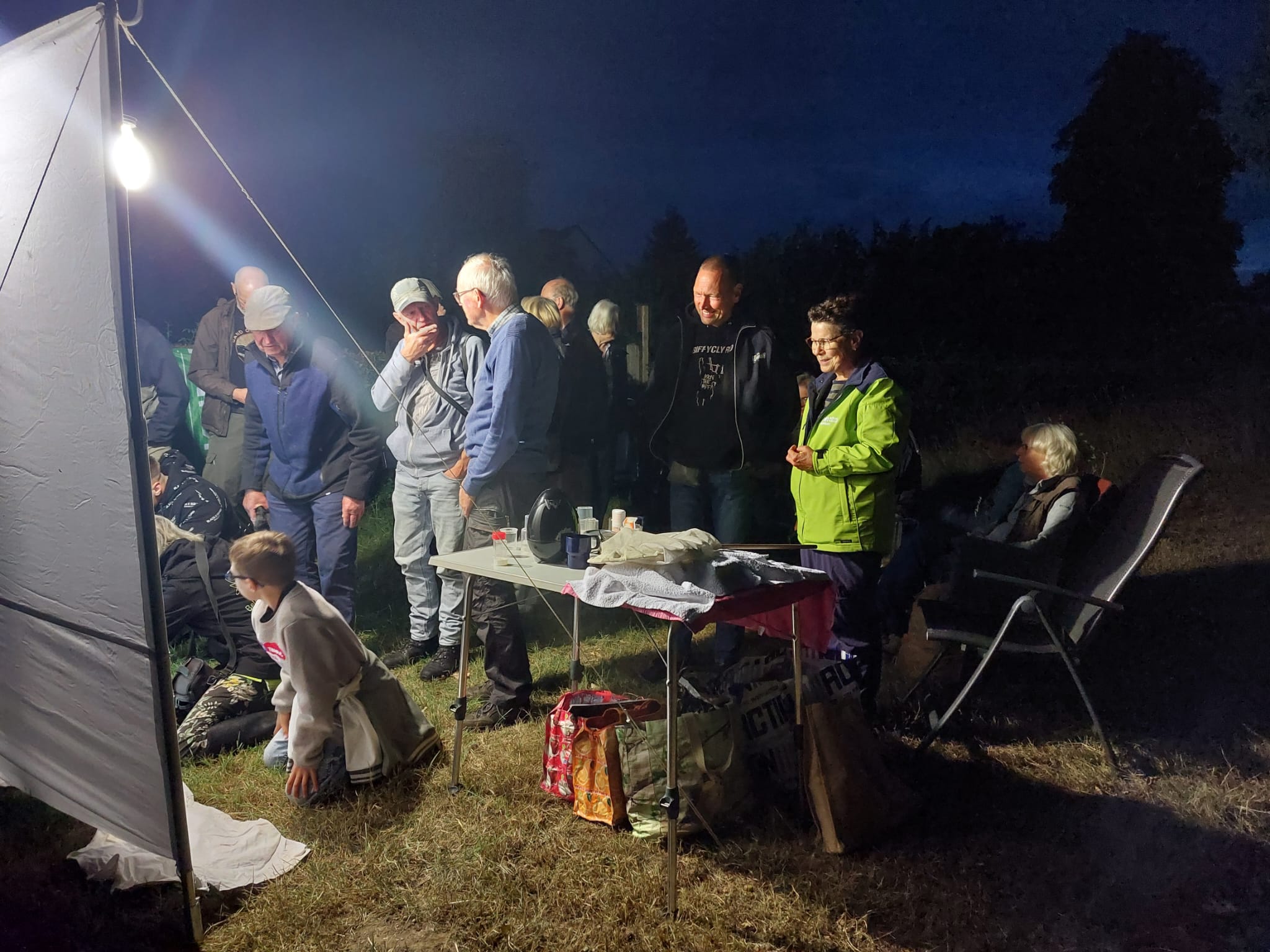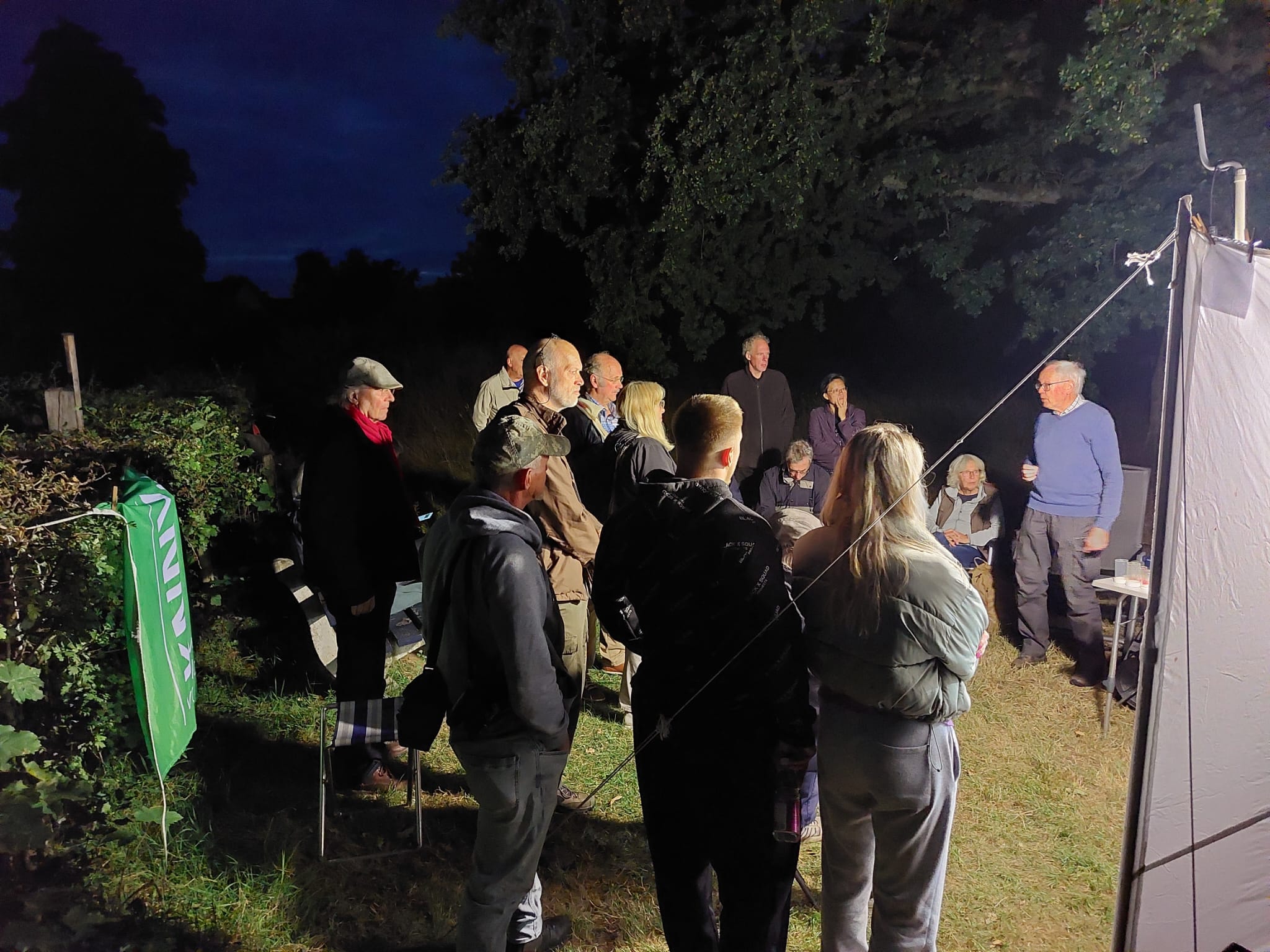 Om 21.30 uur stond het laken gespannen, de felle 250 watt lamp was aan. Jan Kerseboom, nachtvlinder expert van het KNNV Apeldoorn, zag de eerste nachtvlinder: de Oranje wortelboorder. Er waren inmiddels al meerdere mensen, die meekeken naar de verschillende nachtvlinders. Kleine soorten, met grappige namen, zoals de Haarbos.