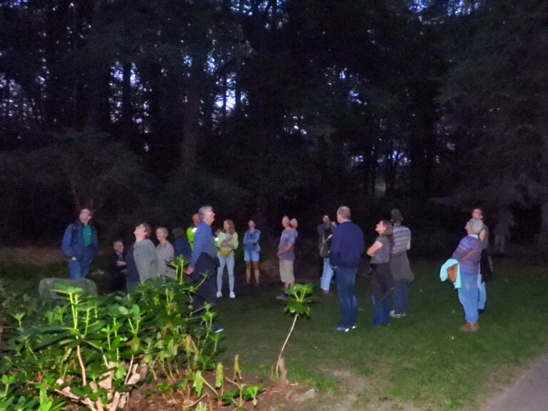 De excursie staat onder leiding van Peter en Carolien. Peter houdt zich al jaren met vleermuizen bezig. Zowel hij als Carolien hebben een batdetector. Die zet de ultrasone geluiden die vleermuizen maken om in geluiden die ook voor ons hoorbaar zijn. Alle 20 deelnemers luisteren aandachtig.