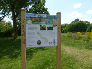 Het bord in het Zuiderpark staat symbool voor alle andere borden die inmiddels geplaatst zijn: Matenpark, Zuiderpark, Kanaalpark en Vellertheuvel. Later dit jaar worden ook borden in het Mheenpark, Park Zuidbroek, Park Woudhuis en IJsvogelpark geplaatst.