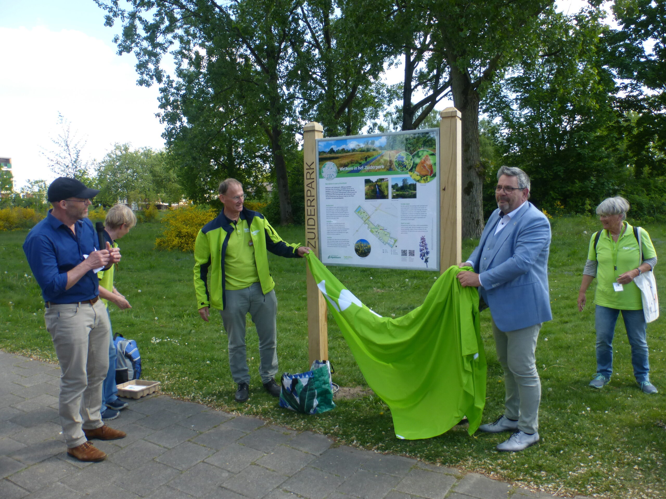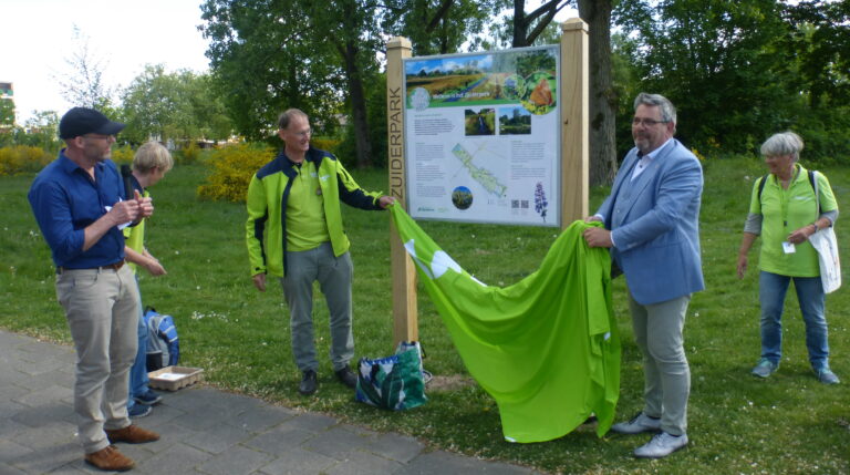 Het bord in het Zuiderpark staat symbool voor alle andere borden die inmiddels geplaatst zijn: Matenpark, Zuiderpark, Kanaalpark en Vellertheuvel. Later dit jaar worden ook borden in het Mheenpark, Park Zuidbroek, Park Woudhuis en IJsvogelpark geplaatst.