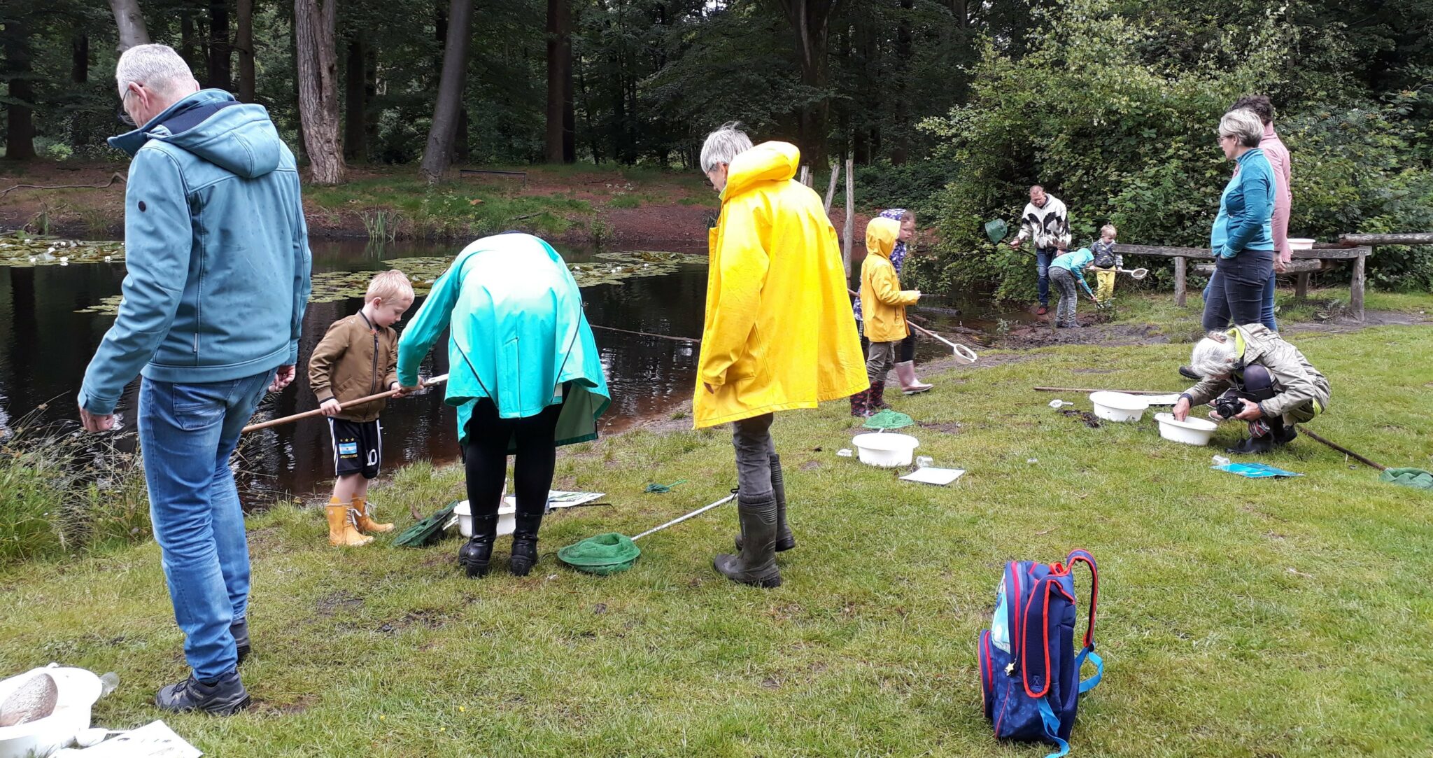 Maar de bezoekers die de regen trotseerden waren blij verrast met hun vangst: waterschorpioenen, staafwantsen, zwemwantsen, kikkertjes, bootsmannetjes, salamanders, vlokreeftjes, larves van libellen en juffers, slakken (zowel land als water) en allerlei kleine waterbeestjes. Na afloop zijn alle beestjes voorzichtig terug gezet in de vijver.