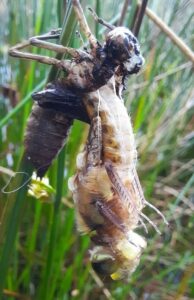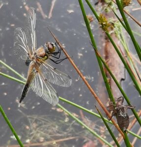 De larven van de libellen, zoals de Viervlek, hebben soms twee jaar in het water geleefd. Wanneer ze volgroeid zijn, kruipen ze via een stengel omhoog, en sluipen uit het larve huidje.