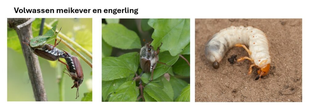 De soort van de maand mei is natuurlijk de meikever. De meikever behoort tot de familie van de bladsprietkevers (Scarabaeidae). Het zijn best indukwekkende kevers met een luid zoemend geluid. Ze vliegen vooral in de avondschemering. De larven (engerlingen leven namelijk 3 tot 5 jaar in de grond en voeden zich met plantenwortels (vooral gras, aardappels, jonge boompjes). Daarna vliegen ze massaal uit. De volwassen kever leeft slechts enkele weken en eet bladeren van bomen zoals eik, beuk en berk.
