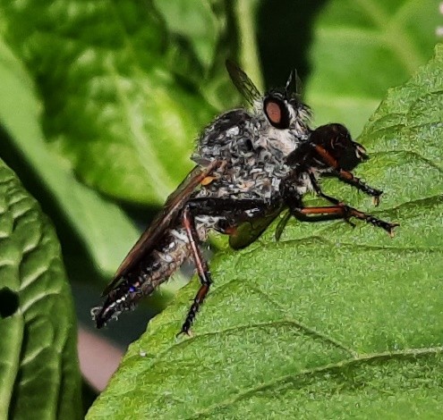 Een andere grote rover is de Bruinvleugelroofvlieg. Deze verschijnt ook wat later. De roofvlieg vangt kleine insecten en eet ze op.