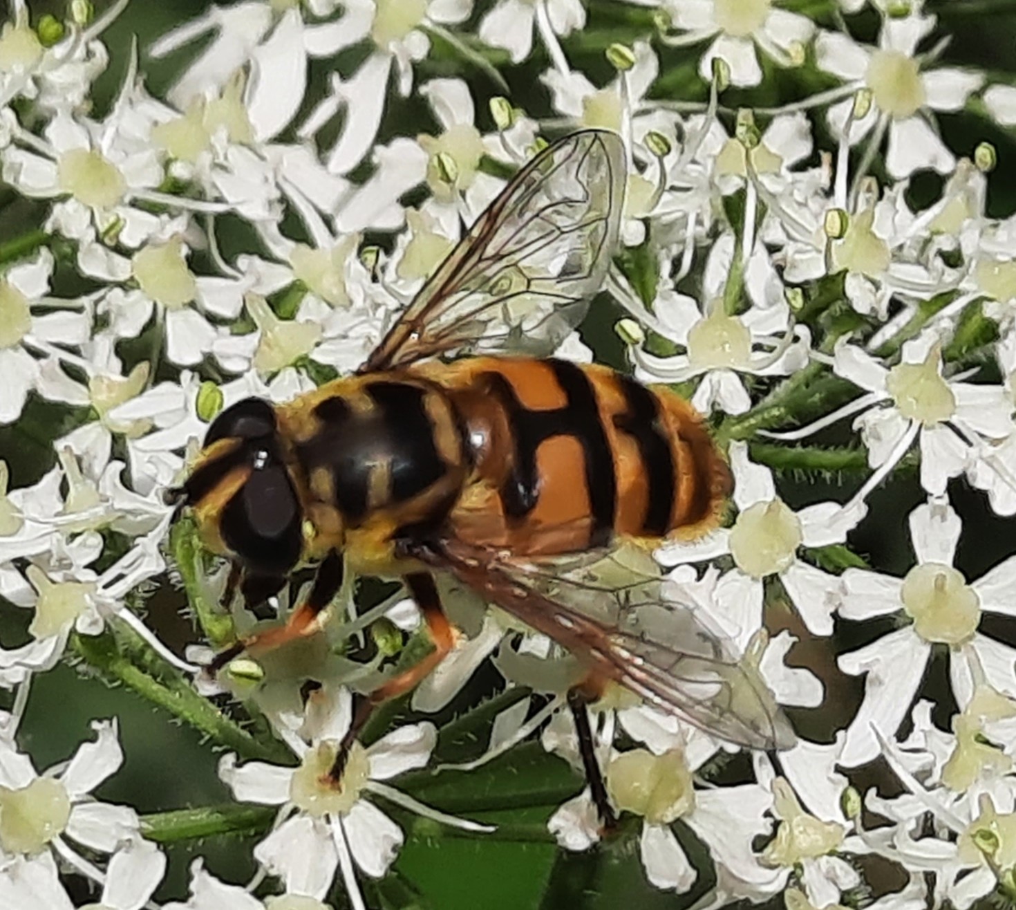 De Doodskopzweefvlieg is er zo èèn. Hij heeft een afschrikwekkende naam, maar het is een onschuldige zweefvlieg. Hij leeft van nectar en stuifmeel. Je hebt wel enige fantasie nodig om in de tekening op het borststuk een doodshoofd te zien.