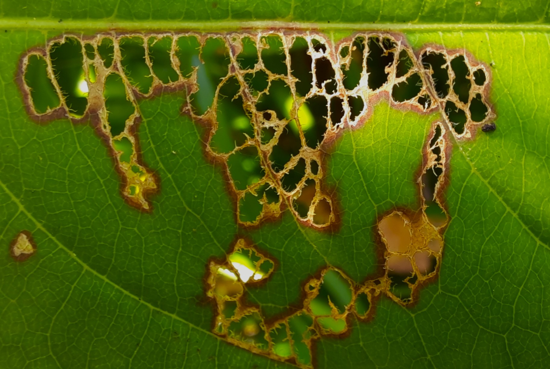 Kijk er eens met andere ogen naar. Je ontdekt mooie patronen in het blad. Een heel klein larfje van een mineermotje heeft het bladmoes tussen de bladnerven opgegeten. Er blijft een kunstwerkje over.