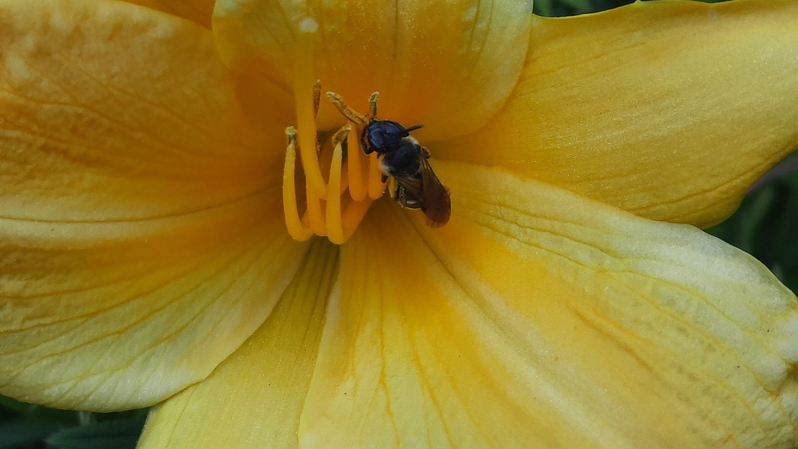 De Tronkenbij is een kleine soort, 7 tot 8 mm. Wanneer je op een bloem iets zwarts ziet, ter grootte van een mier, zou het best een solitair bijtje kunnen zijn.
