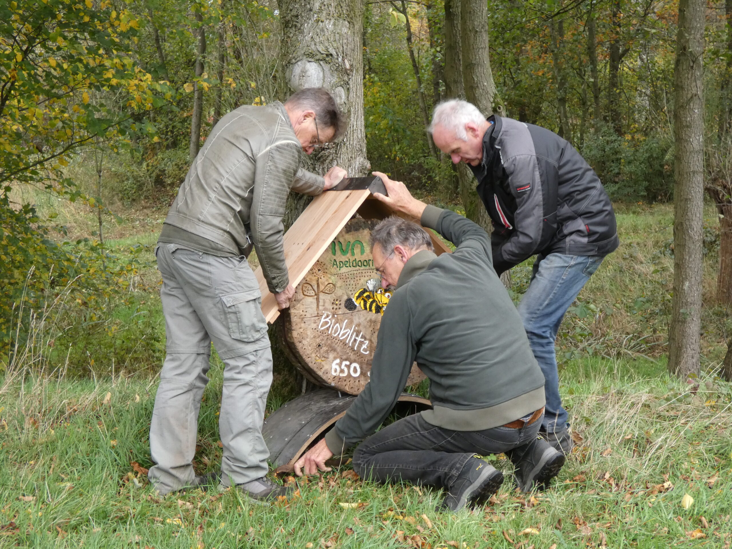 Joop Weijn, die meerdere Bioblitzen heeft bijgewoond, heeft een mooi en tevens nuttig aandenken gemaakt voor de Heemtuin. Een boomschijf met tekst: 65 jarig jubileum van IVN Apeldoorn. Hij heeft meerdere gaatjes in deze boomschijf geboord voor insecten. Dit aandenken werd enthousiast ontvangen. Het werd direct op een mooie, zichtbare plek geplaatst in de Heemtuin.