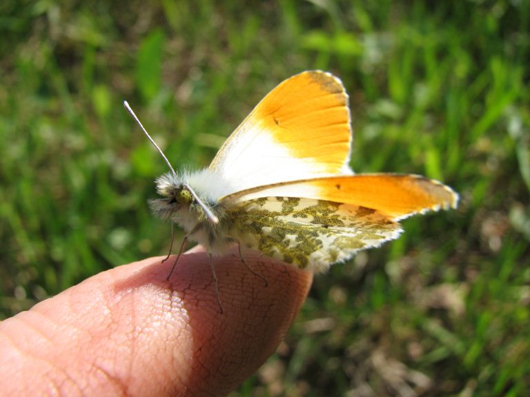 Oranje-witte vlinder zit op een vinger, met onscherpe groene achtergrond.