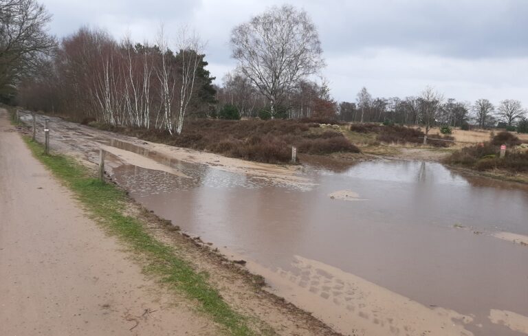 Borden wijzen fietsers erop om af te stappen en te gaan lopen. Op sommige stukken moeten fietsers met een flinke boog de heide op, om enigszins droge voeten te houden. Wie besluit toch op het pad te blijven fietsen, moet over de nodige stuurmanskunst beschikken. Want bij een slippartij kun je zomaar in een grote plas terecht komen.