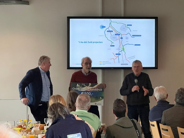 Tijdens de oplevering van het project “Herinrichting Aa dal Zuid” door Waterschap Aa en Maas werd Gerard Claassen door loco watergraaf Ernest de Groot verrast met de toekenning van de Groen-Blauwe-Handdruk. Het waterschap kent elk jaar twee van deze handdrukken toe aan organisaties die zich langdurig hebben ingespannen voor werkzaamheden in de natuur.