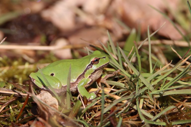 Op deze zonnige zaterdag zagen we opvallende groene blaadjes tussen het gras. Toen we beter keken waren het boomkikkertjes die uit hun winterslaap kwamen en zich aan het opwarmen waren in de zon.