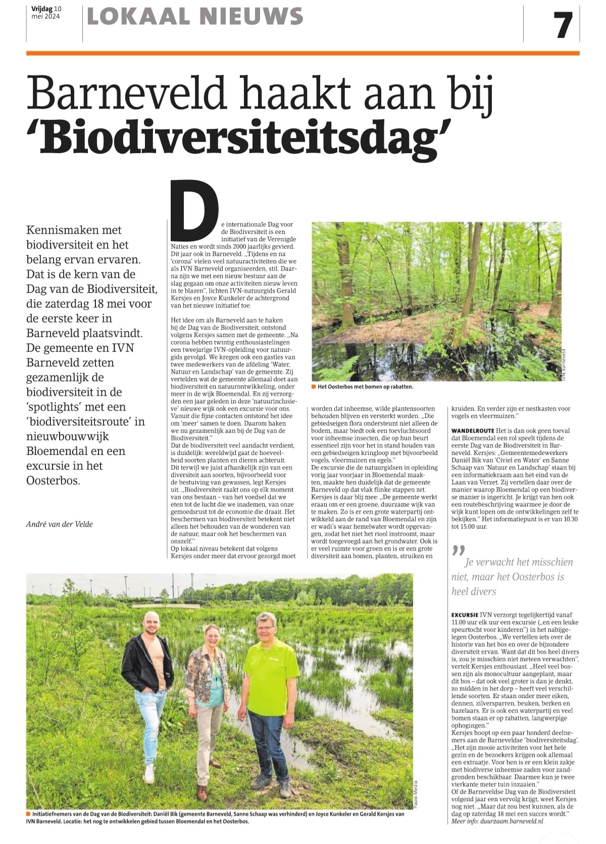 Kennismaken met biodiversiteit en het belang ervan ervaren. Dat is de kern van de Dag van de Biodiversiteit die zaterdag 18 mei voor de eerste keer in Barneveld plaastvindt. De gemeente en IVN Barneveld zetten gezamenlijk de biodiversiteit in de ‘spotlights’ met een biodiversiteitsroute in nieuwbouwwijk Bloemendaal en een excursie in het Oosterbos.