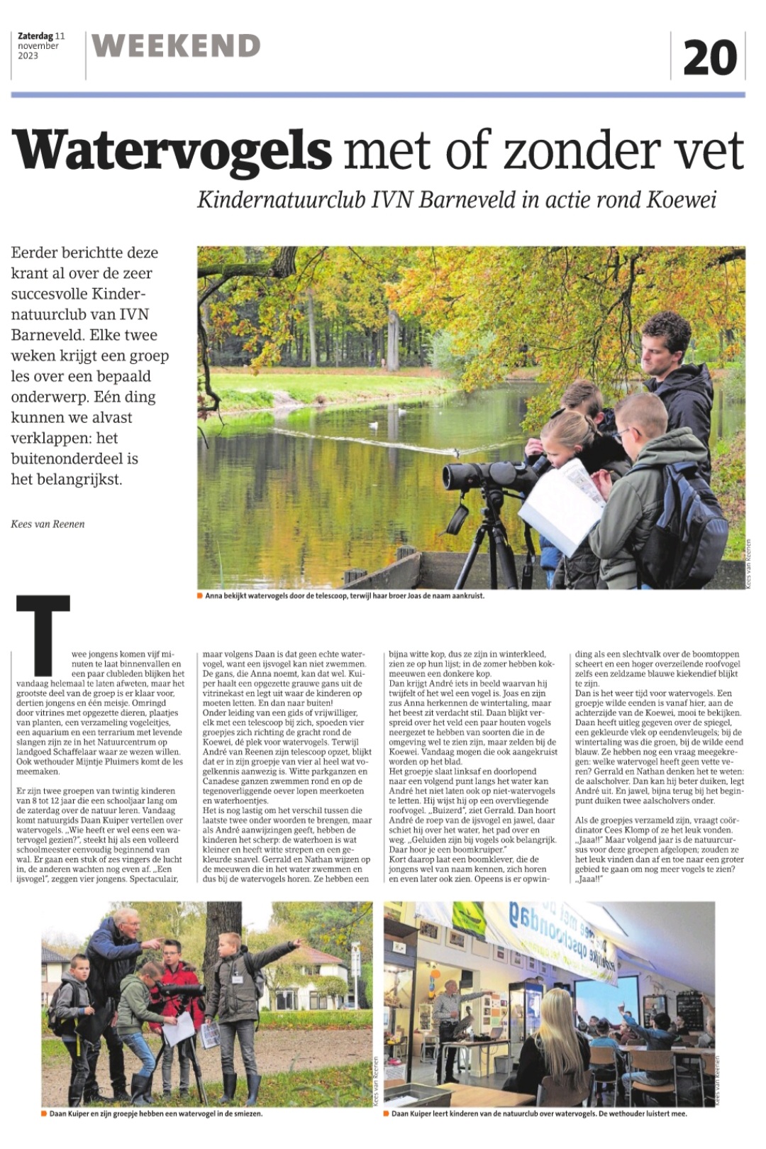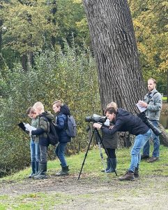 Op zaterdag vier november mocht de tweede groep kinderen op pad met Daan Kuiper en de begeleiders om naar watervogels te kijken. Ook deze groep was heel enthousiast over de uitleg van Daan. Extra leuk was het deze keer dat wethouder Mijntje Pluimers en Kees van Reenen (ecoloog en columnist / journalist van de Barneveldse Krant) ook aanwezig waren om samen met een fotograaf van de krant en onze voorzitter Andre van de Burgwal eens te bekijken hoe leuk de Kinder Natuurclub van IVN Barneveld in de praktijk wel is.
