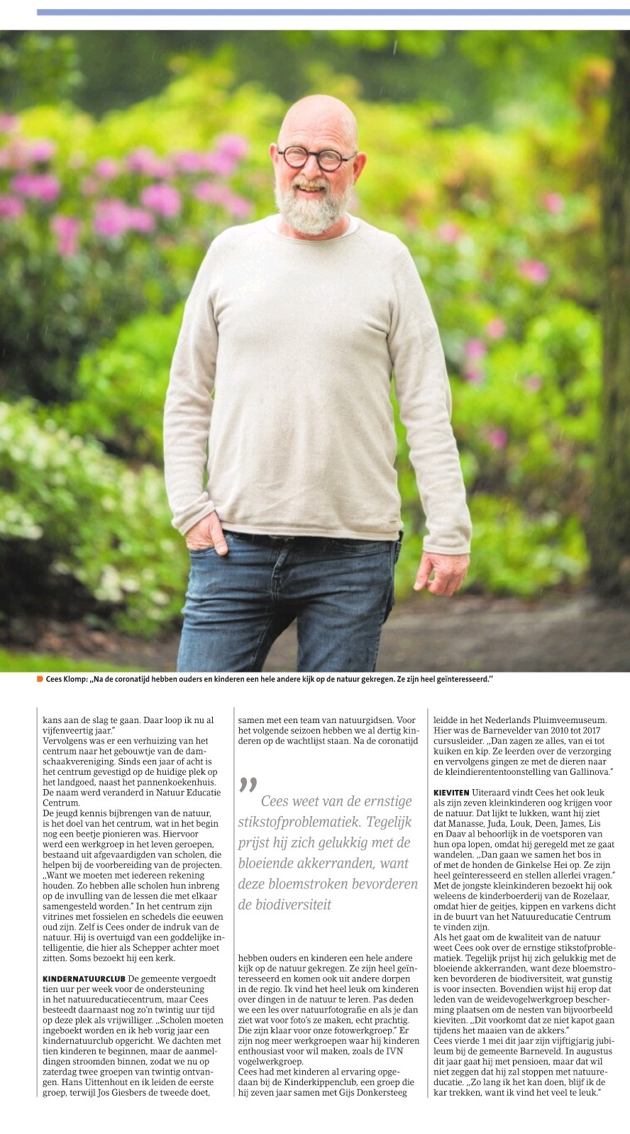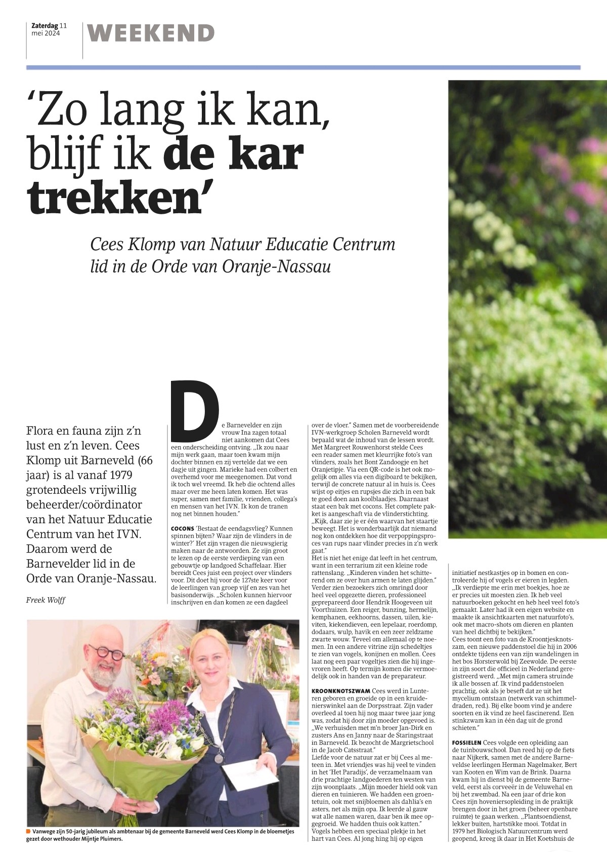 Flora en fauna zijn z’n lust en z’n leven. Cees Klomp uit Barneveld is al vanaf 1979 grotendeels vrijwillig beheerder/coördinator van het Natuur Educatie Centrum van het IVN. Daarom werd de Barnevelder lid in de Orde van Oranje-Nassau.