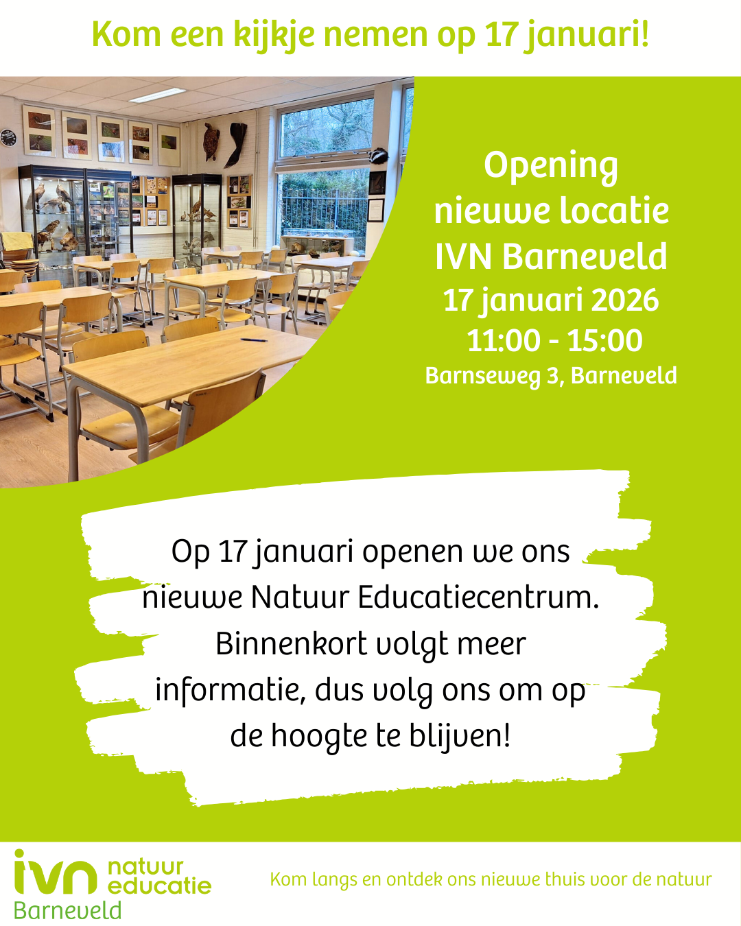 Op zaterdag 17 januari vindt er bij IVN Natuureducatie Barneveld een feestelijke open dag plaats, voor jong en oud, naar aanleiding van de verhuizing naar het gebouw van Aeres MBOBarneveld aan de Barnseweg. De (her-)opening van het Natuureducatiecentrum zal plaatsvinden op zaterdag 17 januari 2026, aan de Barnseweg 3. Van 11.00-15.00 uur is iedereen welkom, op basis van vrije inloop.
