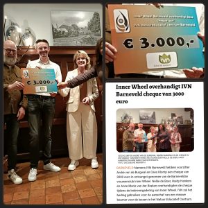 Met veel dankbaarheid namen André van de Burgwal en Cees Klomp namens IVN Barneveld een hele mooie cheque van € 3000 in ontvangst van de dames van Inner Wheel Barneveld. Deze lokale afdeling is verbonden aan een internationale organisatie die zichzelf omschrijft als “persoonlijk verbonden, sociaal bewogen en internationaal betrokken”. Verder is Inner Wheel ook verbonden aan serviceclub Rotary.