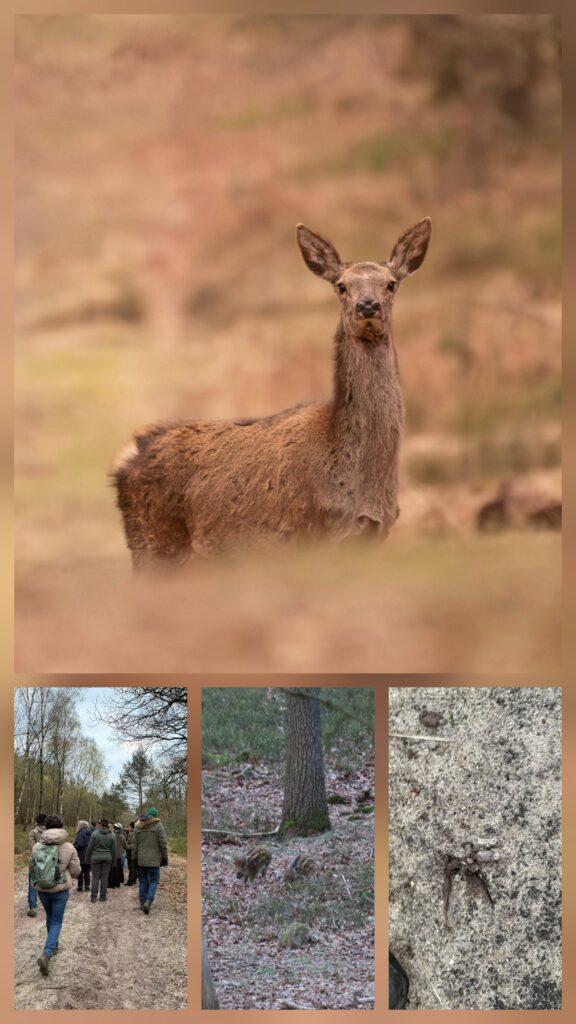 Tijdens de wandeling werden vijf edelherten gesignaleerd. Deze droegen geen gewei, aangezien zij dit in deze periode al hebben afgeworpen. Eén hert bleef rustig staan en poseerde voor een foto, wat een bijzondere belevenis was. Kort daarna werd een foeragerende keiler (een volwassen mannetjeszwijn) waargenomen. Op de vraag van een deelnemer waarom zwijnen vaak langs paden wroeten, legden de gidsen uit dat de grond daar vaak losser en natter is. Hierdoor kan het zwijn met de gevoelige snuit makkelijker diep in de grond naar voedsel zoeken. Wilde zwijnen zijn alleseters die zelfs kadavers nuttigen, al hebben zij met de komst van de wolf nu een natuurlijke concurrent.