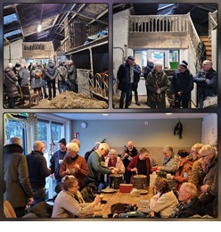 Dat de deelnemers het buiten zijn en het wandelen onder elkaar plezierig vonden, bleek uit de vele gesprekken die ontstonden. Aangekomen bij de boerderij van Van Beuningen op het landgoed, bleek dat de eigenaar, Hein van Beuningen ons gastvrij wilde ontvangen op zijn landgoed. Hij had in de schuur de kachel aangemaakt en stoelen voor ons klaargezet. Hij vertelde ons over de achtergronden van het landgoed en nam ons na afloop van zijn praatje mee voor een prachtige wandeling over een, voor publiek niet toegankelijk, gedeelte van zijn paradijs. Terwijl wij genoten van de natuur om ons heen, de zon op de witte besneeuwde bomen, de reeën, die, niet gewend aan mensen in dit gebied, een goed heenkomen zochten, bracht Hein ons via een omweg terug naar de zorgboerderij, waar Jenneke ons iets vertelde over het reilen en zeilen van de boerderij. Daarna was er overheerlijke snert. Wat een prachtige dag! Met dank aan Gerald, Jenneke, Annelot en aan Hein.