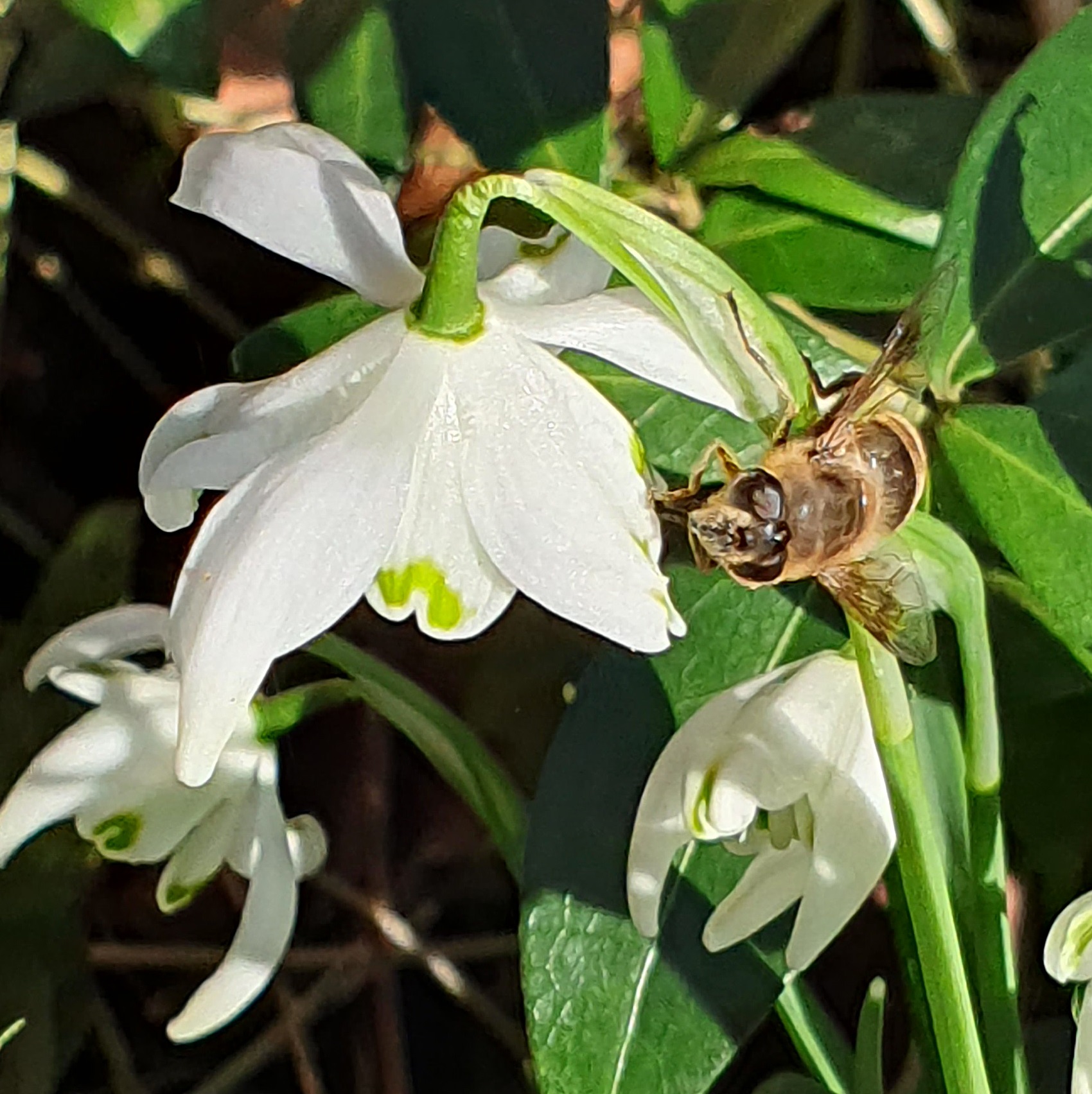 De zon schijnt regelmatig volop. Insecten die als volwassen dier overwinteren profiteren van die momenten om nectar of stuifmeel te zoeken, zoals de Blinde bij (Eristalis tenax).