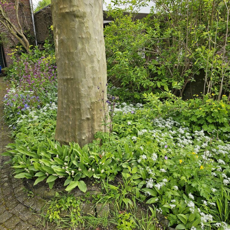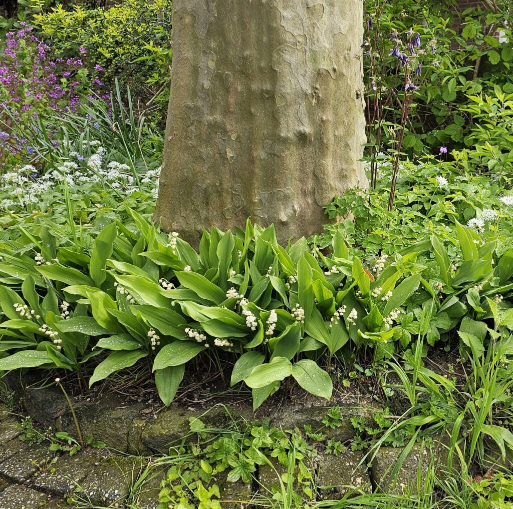 In je eigen tuin kun je daar gebruik van maken. Langs mijn oprit heb ik zo’n border met voornamelijk bosplanten. Op de voorgrond rond een plataan het Lelietje-van-dalen (Convallaria majalis).