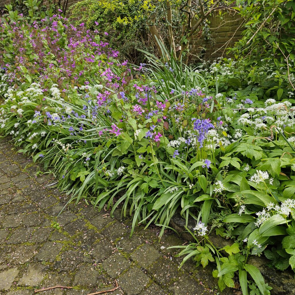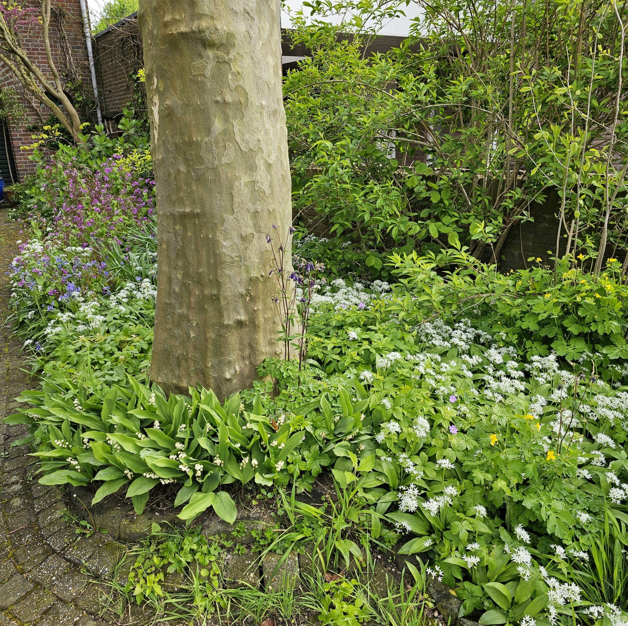 Iets verderop Boshyacint (Hyacinthoides non-scripta) of eigenlijk een nauwe verwant. Judaspenning (Lunaria annua) groeit boven de andere planten uit. Maar de echte blikvanger is toch wel Daslook (Allium ursinum), die een waar tapijt vormt. Over enige tijd wordt het wat rommelig, maar nu is het genieten!