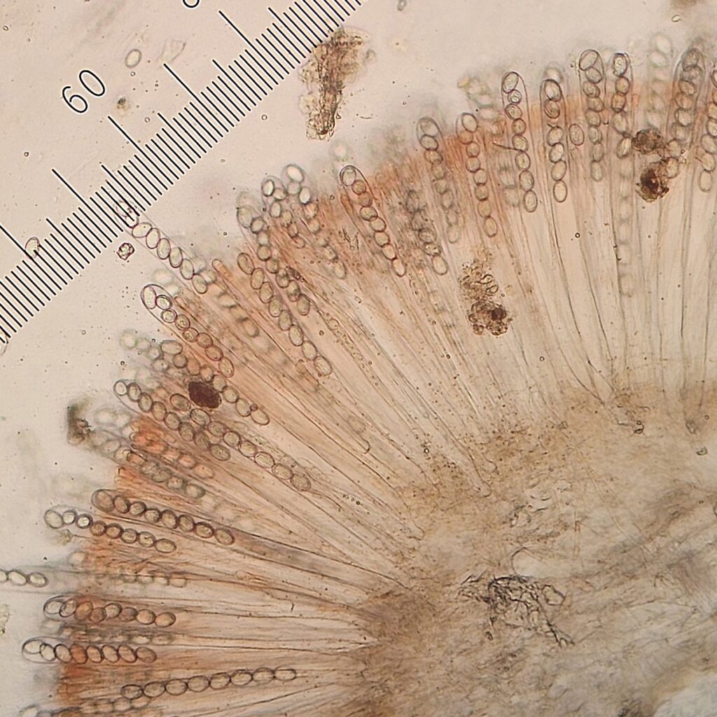 Met een microscoop is er nog veel meer te zien. De delen van het zwammetje die de sporen vormen liggen aan het oppervlak van het rode deel. Door de microscoop kijkend zie je deze waaiervormig gerangschikt, met de vele sporen. De schaalverdeling geeft een idee van de grootte, elke eenheid is 6,67 μm (duizendste millimeter). Leuk om eens te doen.