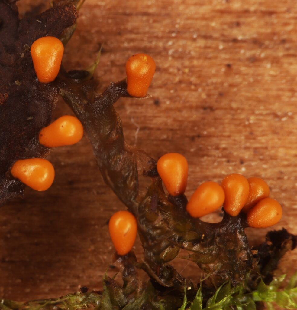 Slijmzwammen zijn letterlijk een klasse apart. De gefotografeerde oranje ‘peertjes’ zijn maar enkele millimeters groot, maar vallen door hun kleur (en aantal) sterk op. Die vruchtlichamen bevatten de sporen en draden die bij rijpheid het geheel een pluizig uiterlijk geven. Die draden heten elateren. Als ze zich ontplooien kan de wind de sporen gemakkelijk meenemen. Wonderlijk, hoe eencellige organismen zo samen kunnen werken en een vruchtlichaam kunnen vormen dat vele malen groter is dan de individuele organismen. Om deze te bestuderen heb je een microscoop en veel geduld nodig, maar dan valt er nog veel meer te zien dan bij een gewone boswandeling.