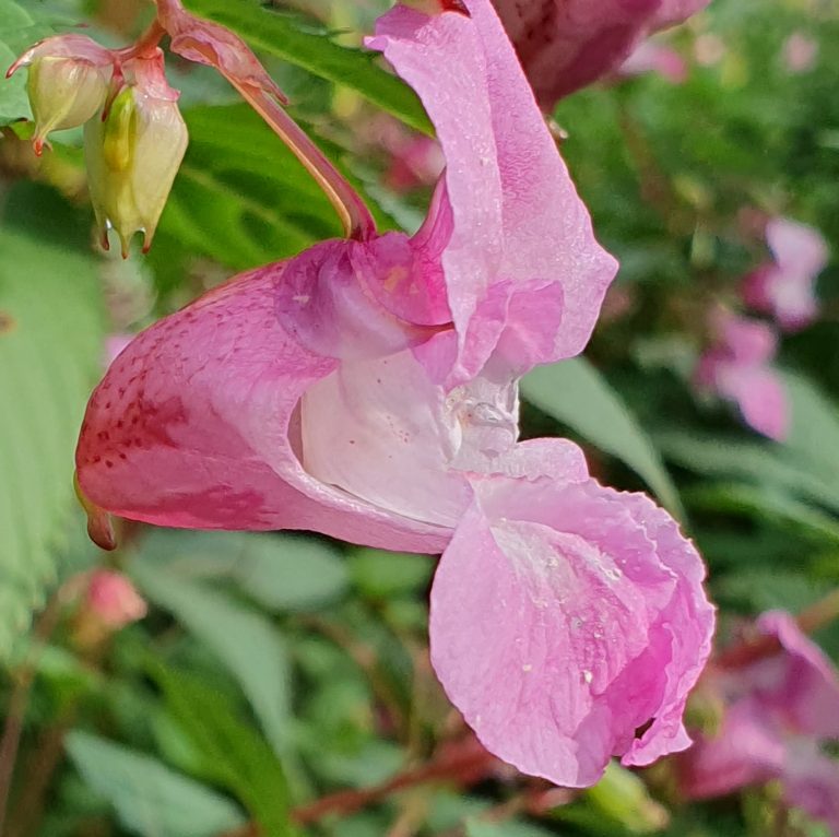 De Reuzenbalsemien (Impatiens glandulifera) is een directe verwant van het tuinplantje Vlijtig liesje.
