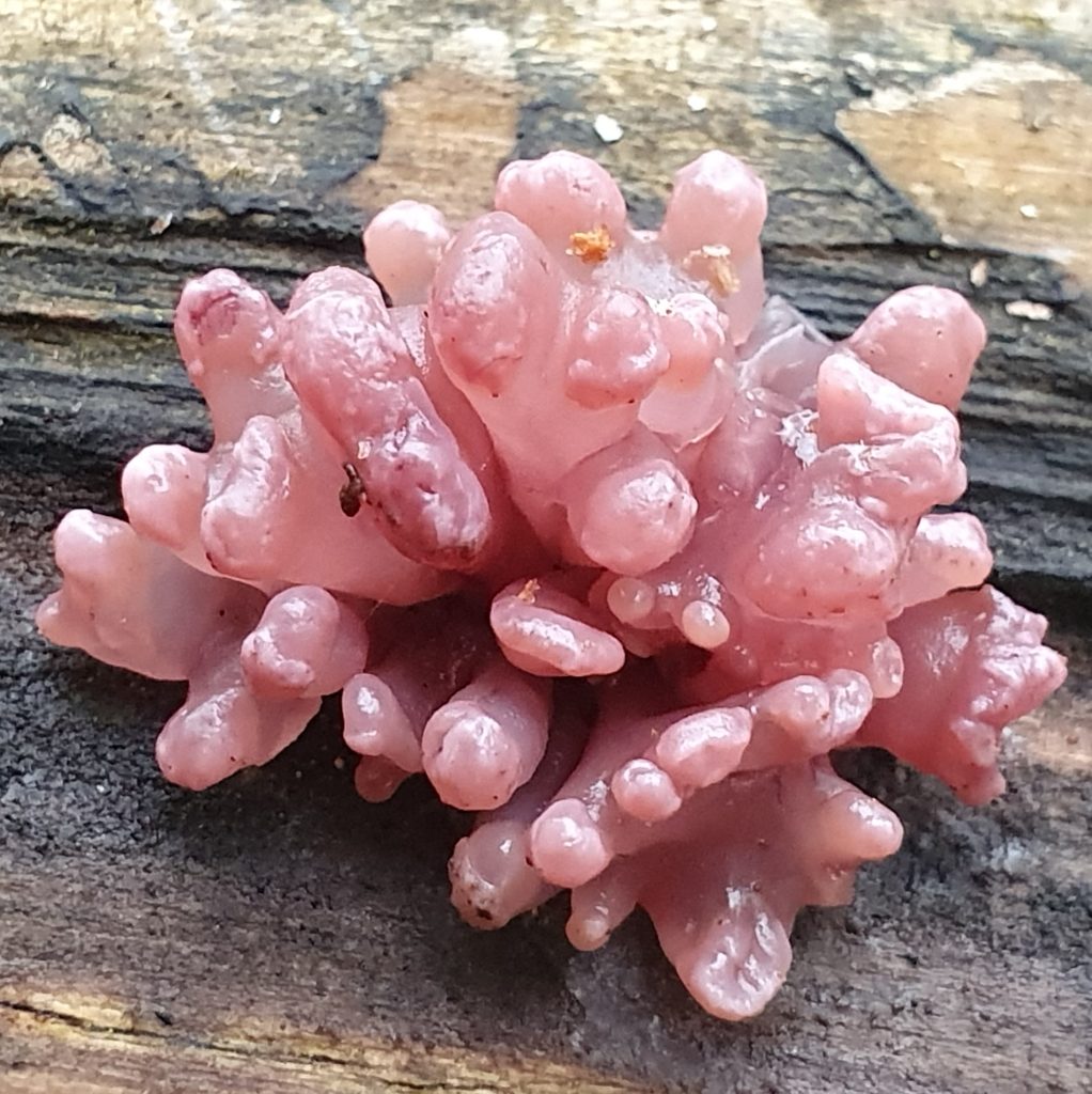 Kleiner dan een vingerhoed groeit er een complete paddenstoel op. In de buurt groeiden meer zwammen, bijvoorbeeld Grote trechterzwam (Clitocybe geotropa), Paarse knoopzwam (Ascocoryne sarcoides), Heksenschermpje (Mycena rosea) en Papierzwammetje (Byssomerulius corium).