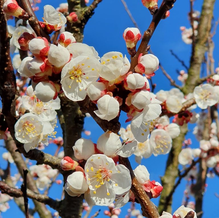Bloesem van de Abrikoos (Prunus armeniaca) tegen een strak blauwe lucht. Schitterend. Maar met drie tot vier graden vorst in de komende dagen wordt het weer geen abrikozen uit eigen tuin dit jaar. Jammer, maar deze fruitboom hoort ook eigenlijk in het Mediterrane gebied en in Klein-Azië thuis en niet hier. Daar vliegen in de bloeitijd ook al veel insecten, hier niet. Nog een reden waarom ik zelden vruchten aan de boom zie.