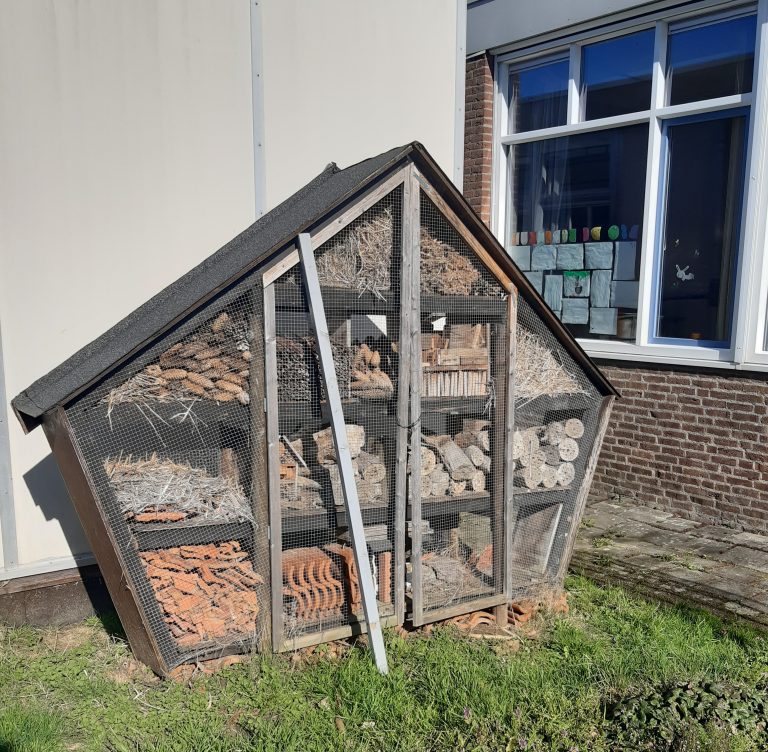 Het insectenhotel wordt al druk bezocht en Kirsti vertelt dat het wel belangrijk is om het hotel met gaas te beschermen tegen de vogels. Anders maak je er een ‘vogelbuffet’ van en help je de bijen van de regen in de drup.