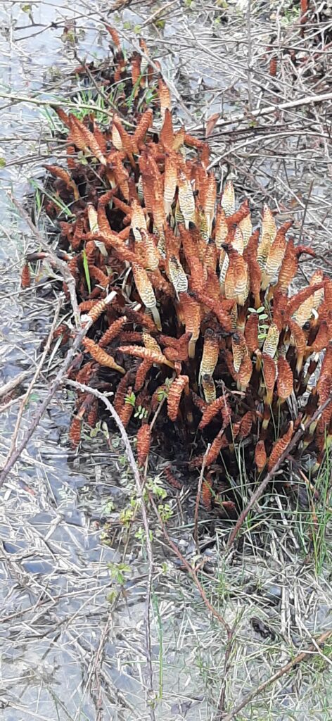 Stef vertelde over het ontstaan van het gebied, de aanwezige grondsoorten en wat dit betekent voor de groei van de verschillende plantensoorten. We zagen prachtige reuzenpaardenstaarten, espengallen en rozengallen als broedplaatsen voor muggen, en graslanden die door begrazing met schapen schraal worden gehouden. Dit maakt ze uitermate geschikt voor bijvoorbeeld de groei van orchideeën.