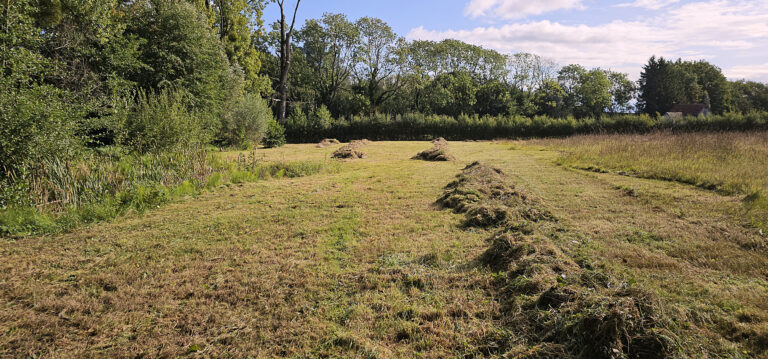 Deze week is er door Luijten Groentechniek gemaaid. Dankzij de harde werkers van dit bedrijf en de verkregen subsidie van de Rabobank is het karwei goed en snel uitgevoerd. Dank voor degenen die dit mogelijk gemaakt hebben. Maar daarmee is het werk nog niet af. Het gemaaide gras ligt nu op rillen, langwerpige hopen. En nu moeten de harde werkers van het IVN en de Buurtvereniging in actie komen.