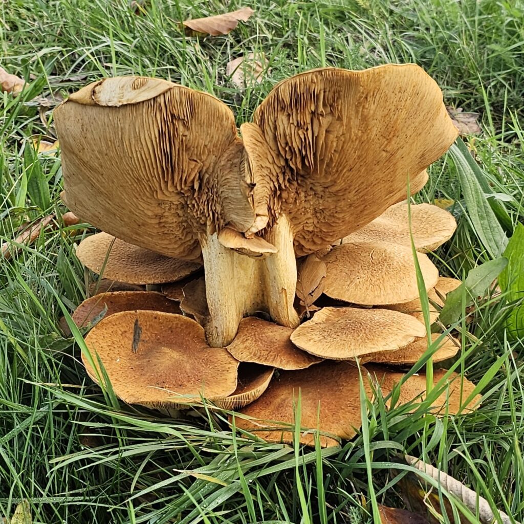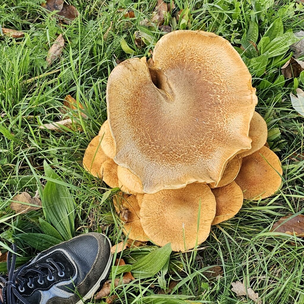 Er klopt van alles niet aan deze paddenstoel. De soort groeit vooral op zandige, venige of voedselarme grond, deze op löss. De Gewone krulzoom is een mycorrhiza-schimmel, hij werkt samen met een boom. Hij helpt de boom vooral water en bepaalde voedingsstoffen uit de bodem op te nemen. Deze krulzoom groeit niet in de buurt van een boom. En hij is veel te groot, d.w.z één ervan is veel groter dan de andere. Om dat te laten zien heb ik mijn schoen erbij gefotografeerd. De grotere lijkt wel een ‘Siamese-tweeling’. Een aantal kenmerken wijst daarop, zoals de op doorsnede u-vormige steel.