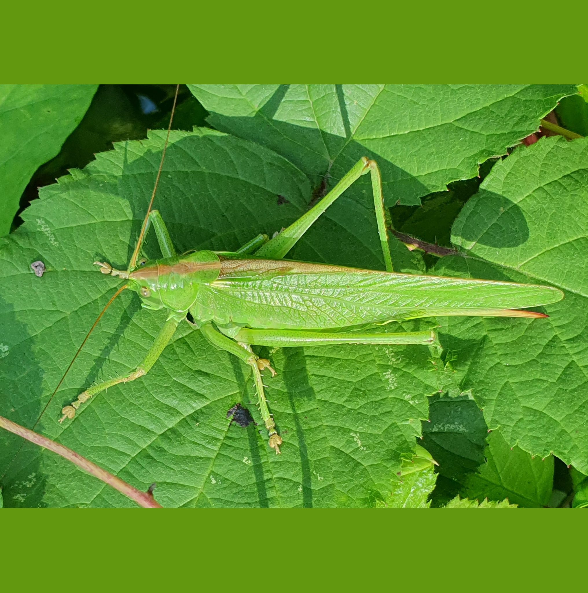 Het dier dat je hier zo argwanend aankijkt is de Grote groene sabelsprinkhaan (Tettigonia viridissima).