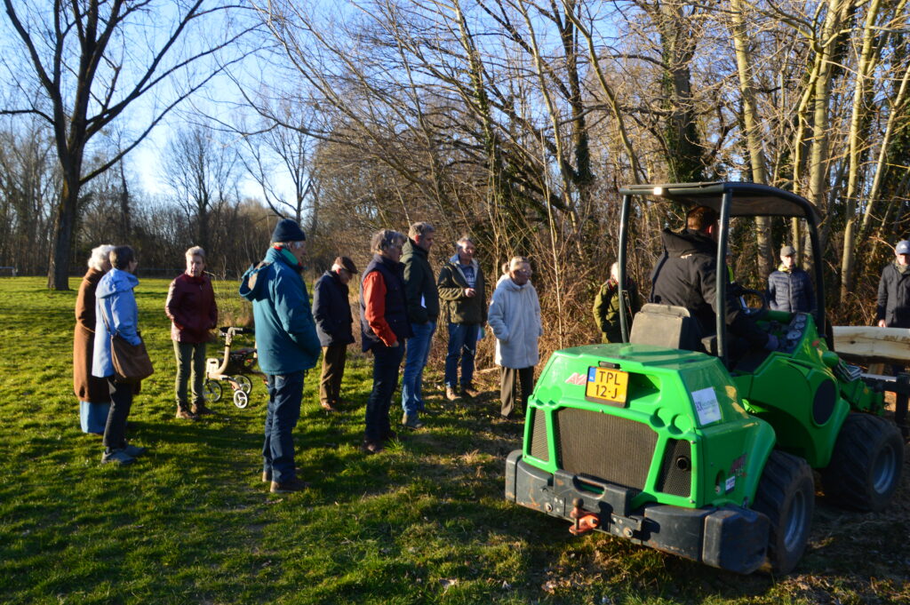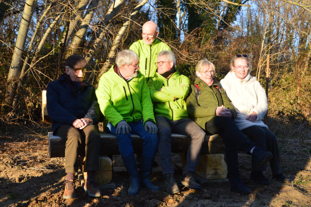 Een groepje trouwe leden, buurtbewoners en geïnteresseerden stonden in de avondzon te wachten. Rond 17.30 uur werd de bank geleverd, die de gemeente Beekdaelen aan IVN Beekdaelen-Nuth geschonken heeft voor ons 50 jarig bestaan.
