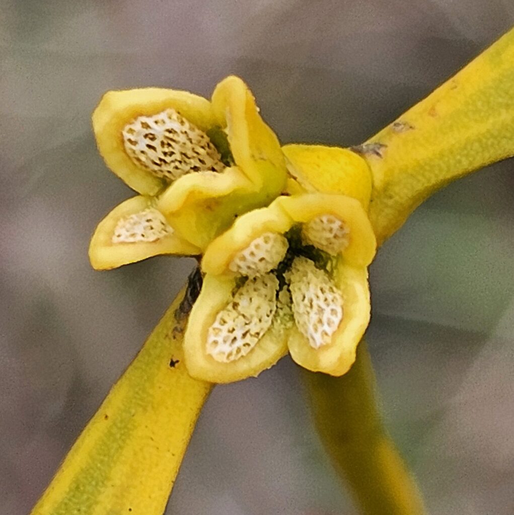 Een bloem van dichtbij bekeken lijkt slechts uit vier bloemblaadjes te bestaan met daarbinnen … Ja wat? Dat zijn meeldraden. In een volgend plaatje zie je de stuifmeelkorrels zitten. Een vrouwelijke bloem is al net zo vreemd. Vier bloemblaadjes en daartussen een stamper. Na bevruchting zwellen de bloemblaadjes op en versmelten. Het wordt een bes. In het midden zijn de puntjes van de blaadjes nog zichtbaar, net als een stukje van de stamper.