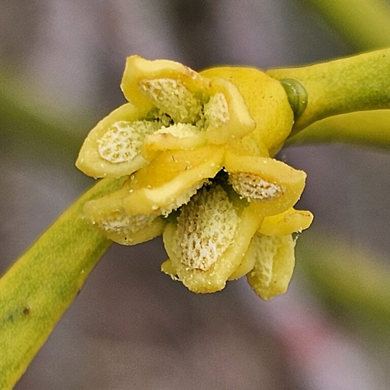 Een bloem van dichtbij bekeken lijkt slechts uit vier bloemblaadjes te bestaan met daarbinnen … Ja wat? Dat zijn meeldraden. In een volgend plaatje zie je de stuifmeelkorrels zitten. Een vrouwelijke bloem is al net zo vreemd. Vier bloemblaadjes en daartussen een stamper. Na bevruchting zwellen de bloemblaadjes op en versmelten. Het wordt een bes. In het midden zijn de puntjes van de blaadjes nog zichtbaar, net als een stukje van de stamper.