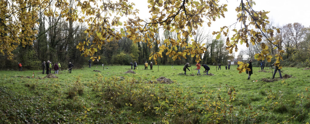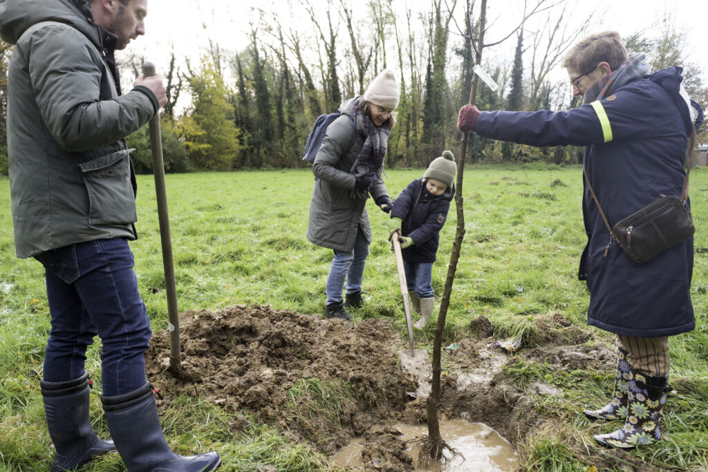 Zo werden woensdag ruim voor het begin van het plantfeest de bomen over het terrein verdeeld en gereedschappen klaargezet. Daarbij lieten de weergoden het afweten, het sneeuwde! Maar om half drie was het droog en begon het plantfeest. Optimaal was het niet, een aantal plantgaten stond vol water, maar het zal met de bomen wel goed komen.