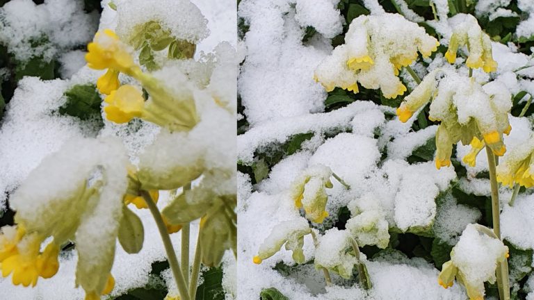 De Gulden sleutelbloem (#Primula veris) doet het prima in mijn tuin. De zaden kiemen graag tussen de stenen van het tuinpad, de jonge planten zet ik in de tuin. Concurrentie ontweken. De wetenschappelijke naam was vroeger Primula officinalis. ‘Officinalis’ duidt er op dat deze plant in de apotheek gebruikt wordt, een geneeskrachtige werking heeft. Vooral de wortels zijn belangrijk, ze smaken naar anijs en worden onder andere bij hoest en problemen van de luchtwegen gebruikt. De planten bloeiden al in maart. Normaal bloeien ze ergens half april. De kans dat ze dan in de sneeuw belanden is klein, maar nu dus even niet.