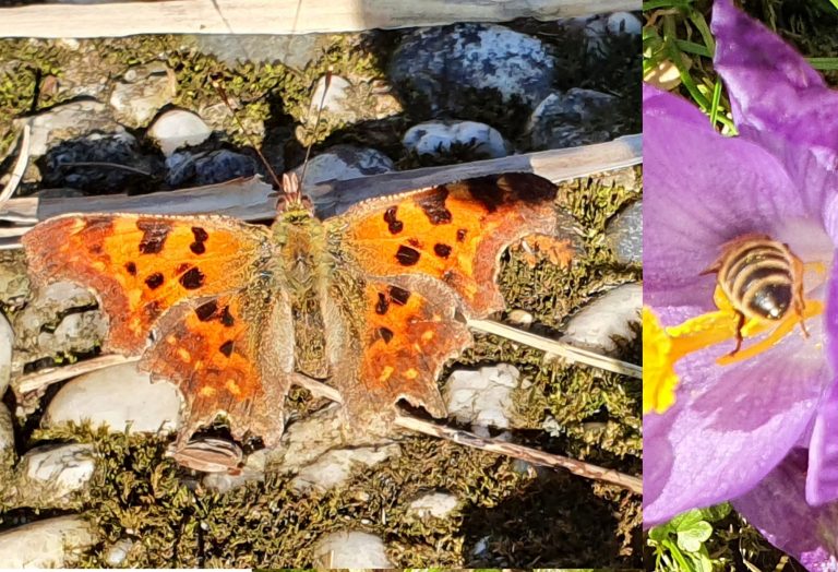 Er vliegen weer vlinders. Een van de eerste was de Gehakkelde #aurelia (#Polygonia c-album). Deze soort overwintert als volwassen vlinder. Hij kruipt weg in holten van oude bomen of tussen afgevallen blad. In de lente is hij er dan weer snel bij. Er zijn twee generaties per jaar, deze zien er verschillend uit. Dit is de wintervorm, met zeer sterk ingesneden vleugelranden. Ook de honingbijen zijn weer actief. Over enkele weken komen daar de wilde, solitaire bijen bij.