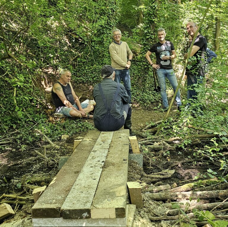 Er is slechts één karwei aangepakt: het herstel van een oud pad van de Spoorstraat in Nuth naar Hellebroek. Het is een echt ‘laarzenpad’, plaatselijk veel nattigheid en modder. Dat is prima, natuur moet je kunnen beleven. Maar zeker in tijden met veel regenval in korte tijd wordt het laagst gelegen deel van het pad wel erg onbegaanbaar. Daarom zijn er zaterdag enkele bruggetjes aangelegd.