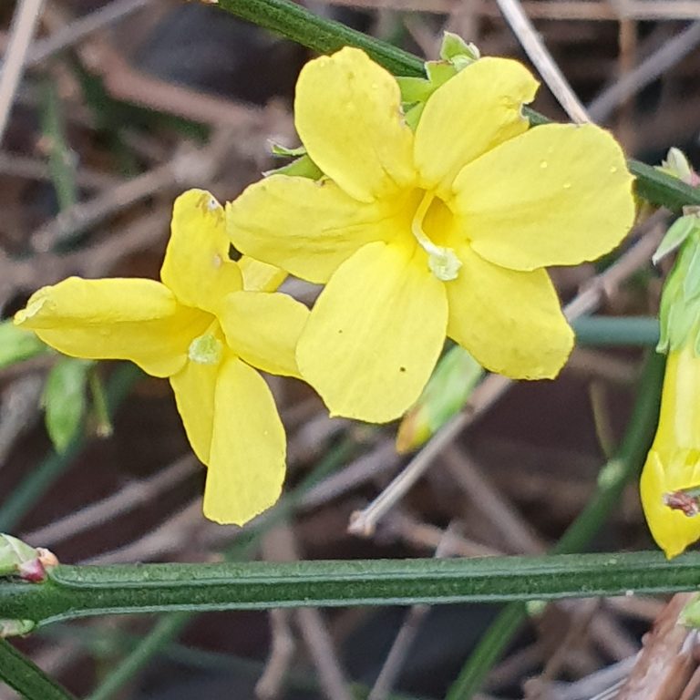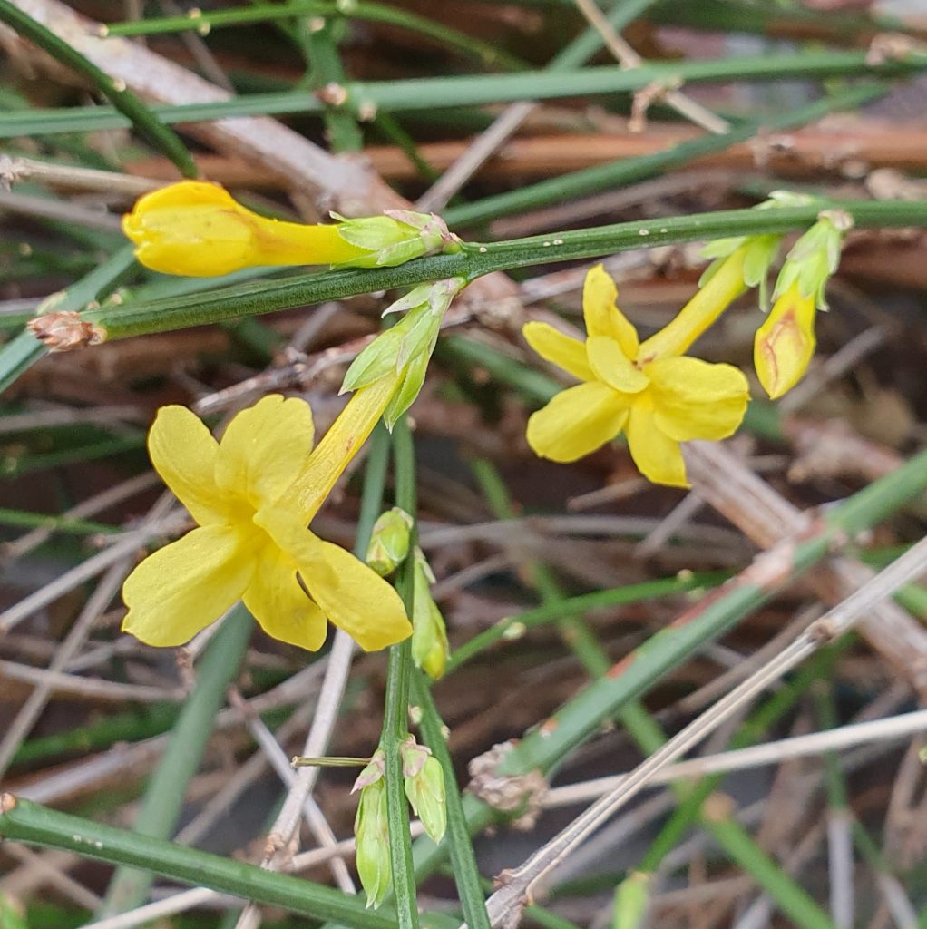 Het lijkt wel of de Winterjasmijn (Jasminum nudiflorum) ieder jaar vroeger begint te bloeien.