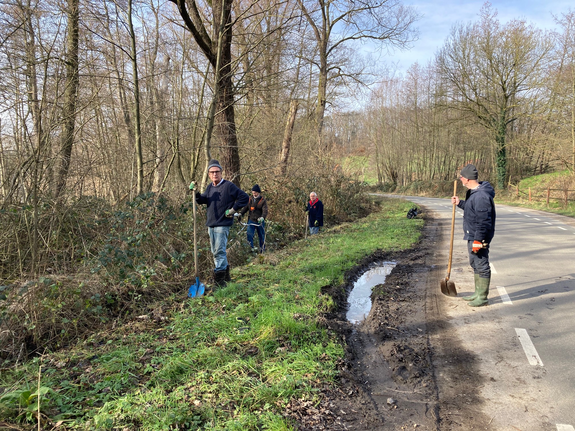 9 februari jl. heeft de Paddenwerkgroep de paddengoten in Thull weer opgeschoond. De brandweer had op maandag de doorgangen al doorgespoten. Nu is het aan ons om die goten weer goed bruikbaar open te maken. Nico Rompelberg heeft de taak van Jan Heijmans voortvarend opgepakt en zo zijn we klokslag 11.00 uur aan het werk. Met de bosmaaier worden de woekerende bramen gekortwiekt. Dat is ook wel nodig en met schoppen en een hark gaan we aan het werk. Het is best wel zwaar werk. Als de goten weer volstromen met water zie je meteen zichtbaar dat de goten er toch redelijk uitzien. Om 12.30 uur even een gezellige onderbreking in de Muldermolen, vervolgens weer flink aan het werk. Omstreeks 14.00 uur zijn we klaar met het zinvolle, jaarlijks terugkerende werk ten behoeve van de padden.
