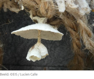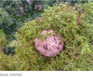 Het nest is niet te onderscheiden van het voorjaarsnest van de Europese hoornaar. U herkent het door te kijken naar de werksters van de Aziatische hoornaar die uit het nest kruipen.