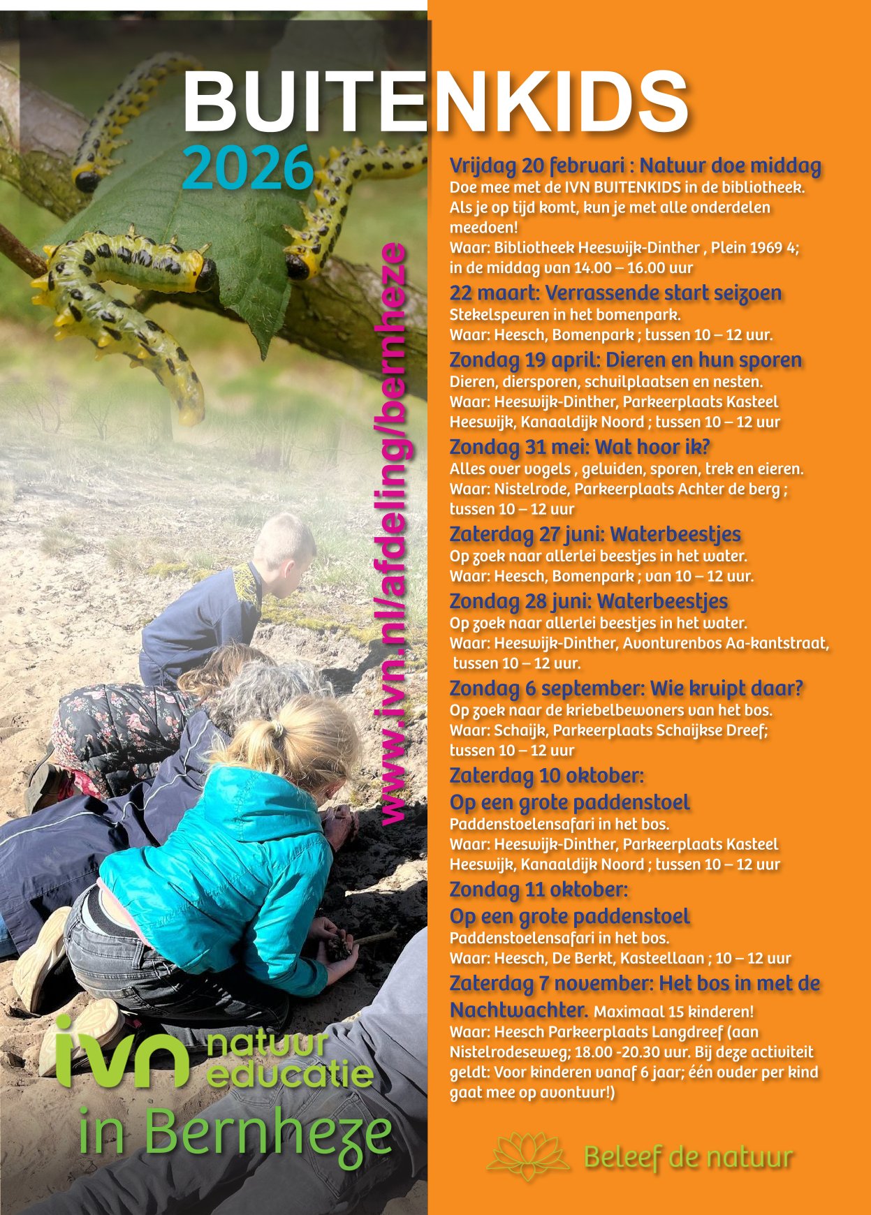 - Zondag 19 april: Nieuw Leven in het bos; dieren, diersporen, schuilplaatsen en nesten. Locatie: Heesch ; Vakantiepark Zevenbergen ; 10 – 12 uur